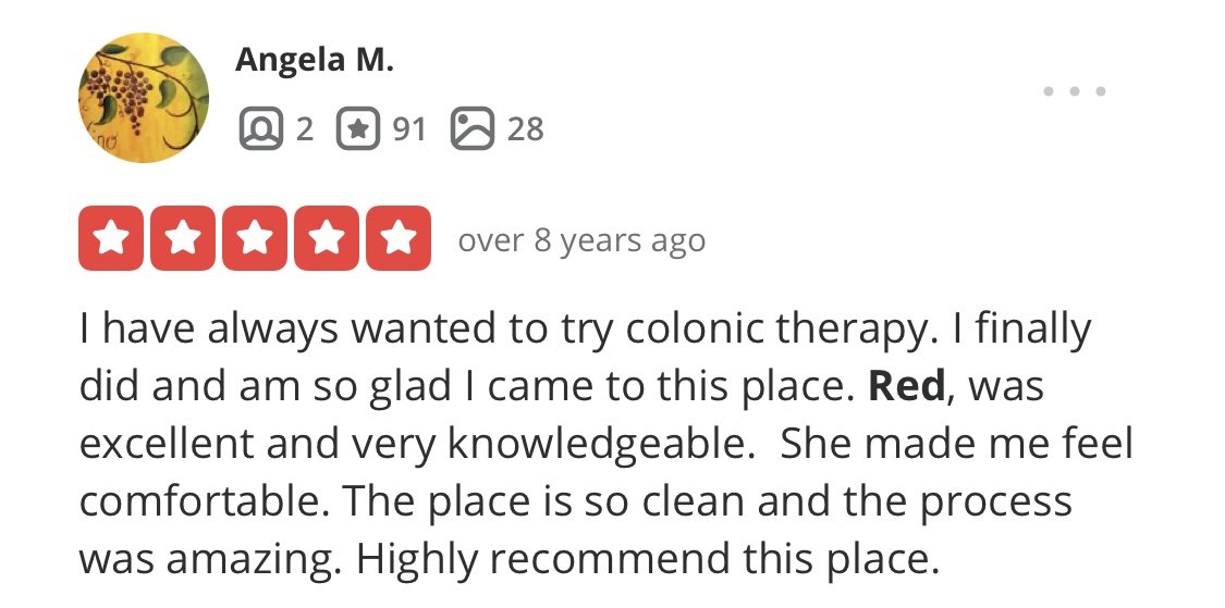 “it is hard to overstate my gratitude to Red for her skill and kindness. she always makes me feel like her most important client, taking time, answering all of my questions and administering the gentlest, most thorough colon cleansing possible.”