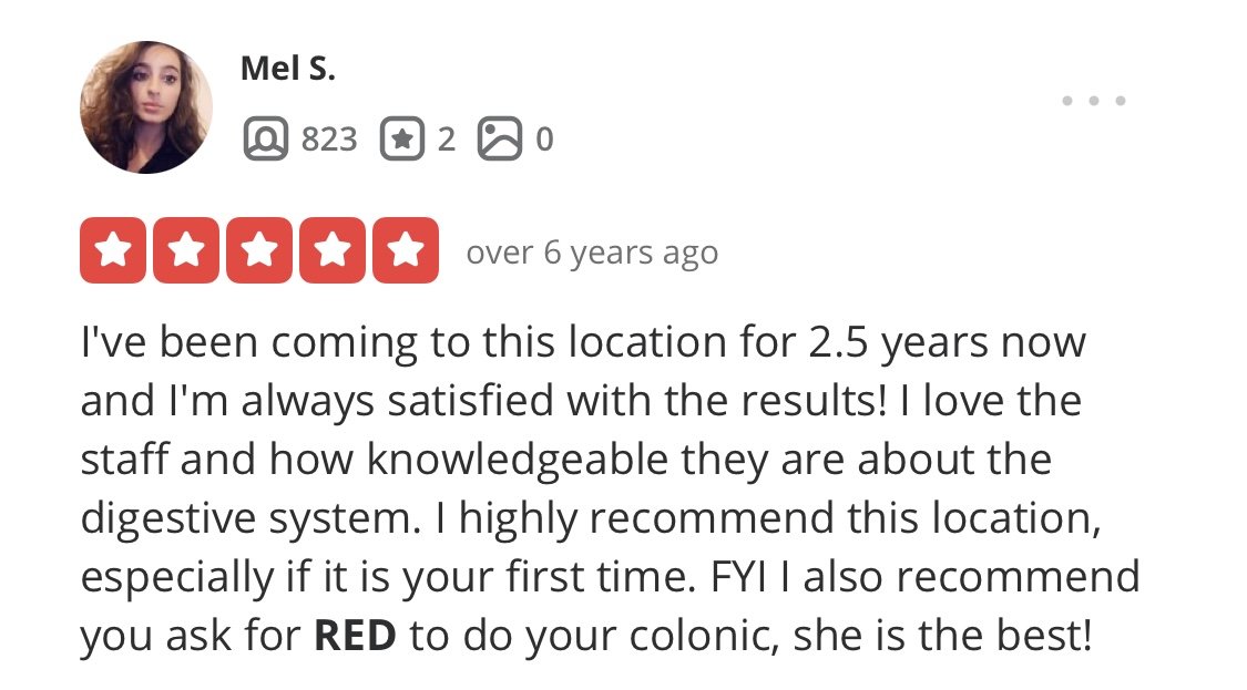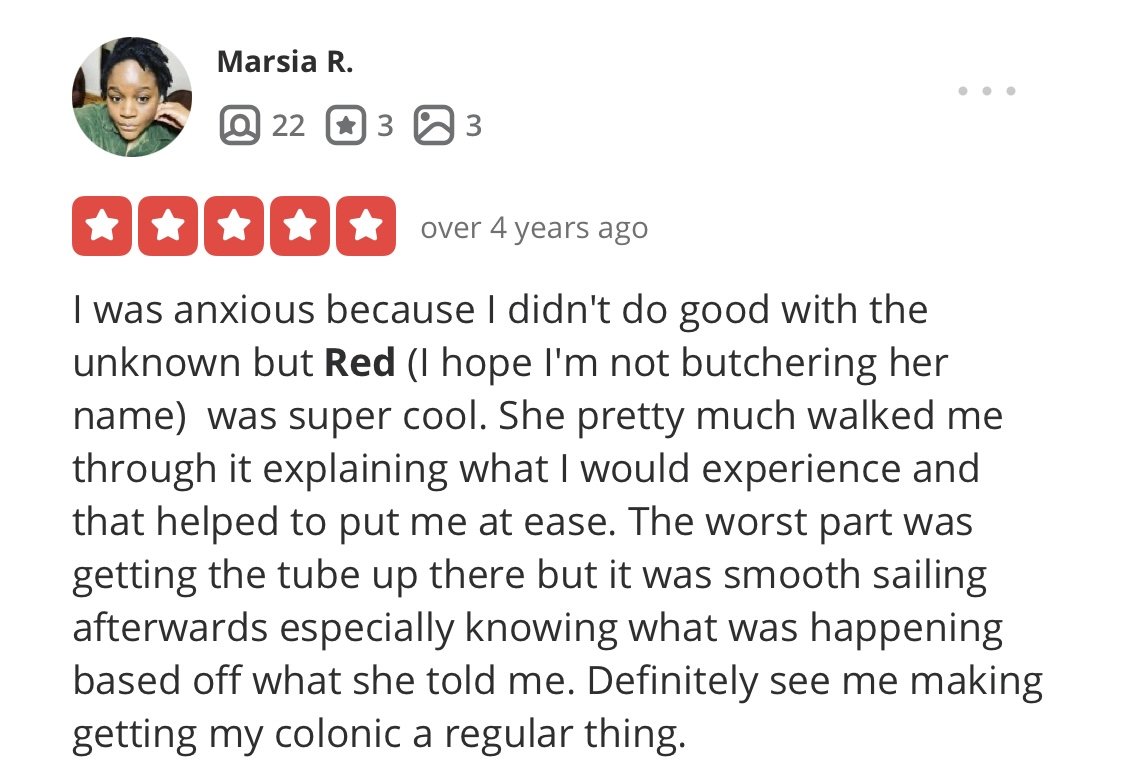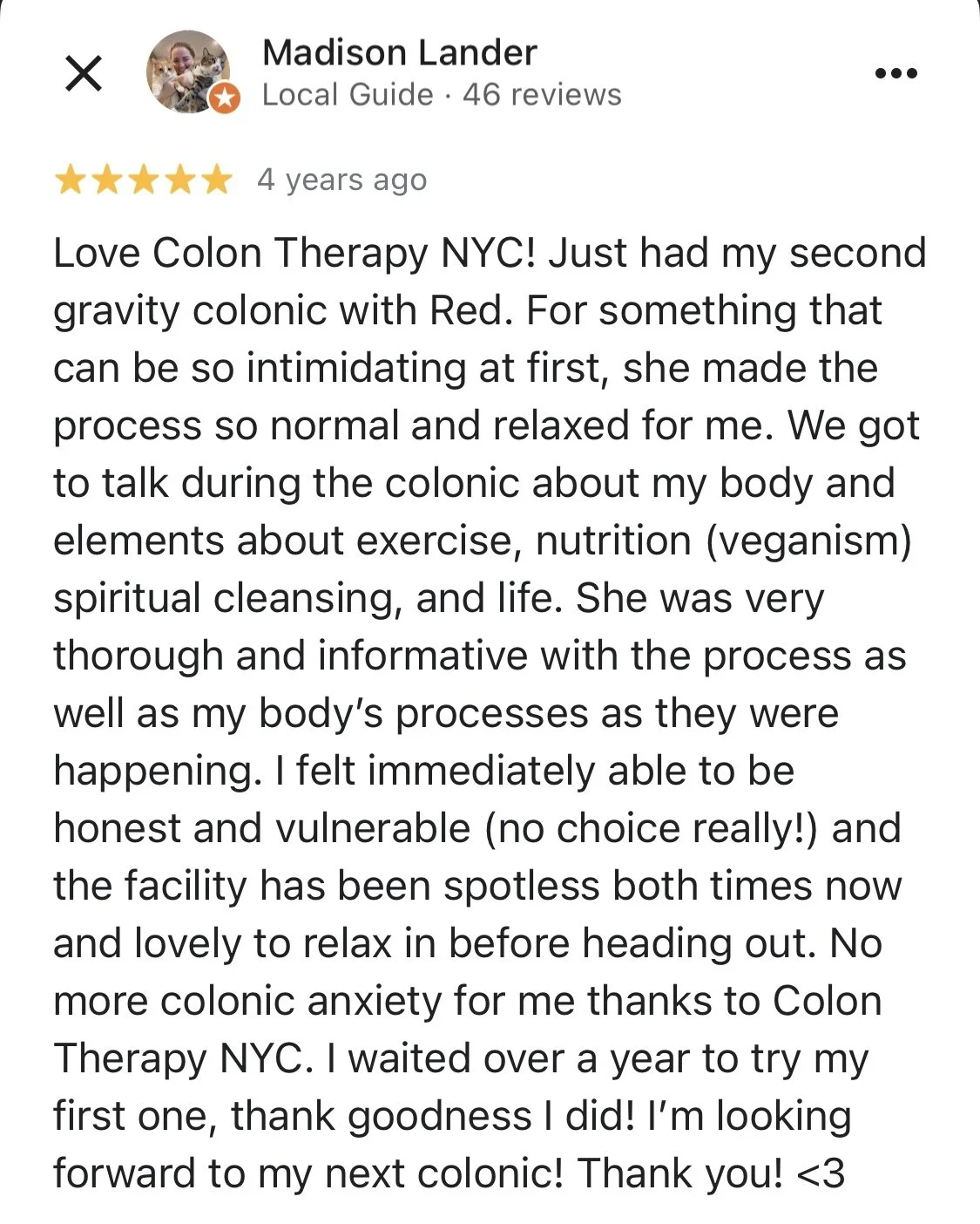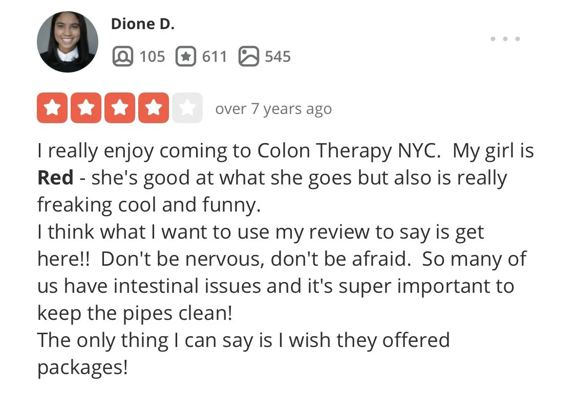“i’ve been receiving regular colonics since 2010 and i’ve been to many therapists in nyc...conclusion? Red gives the best colonic in nyc!”