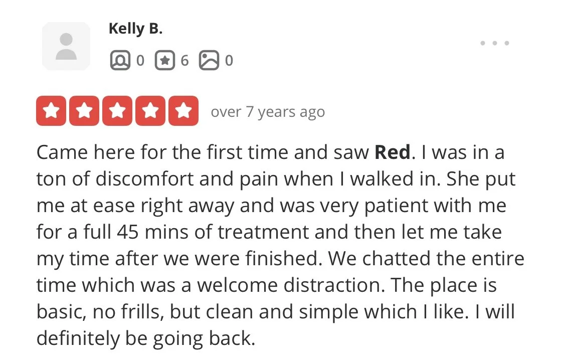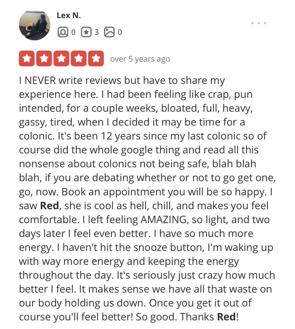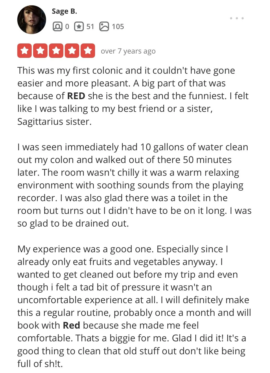 “i’ve been receiving regular colonics since 2010 and i’ve been to many therapists in nyc...conclusion? Red gives the best colonic in nyc!”