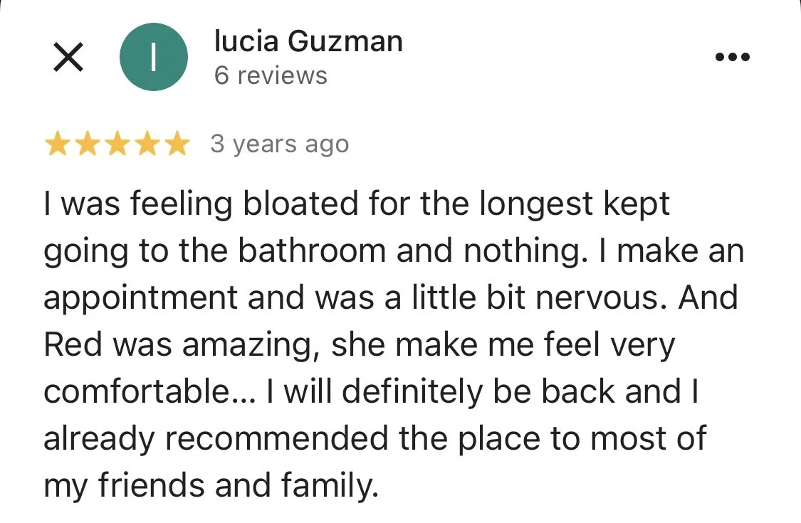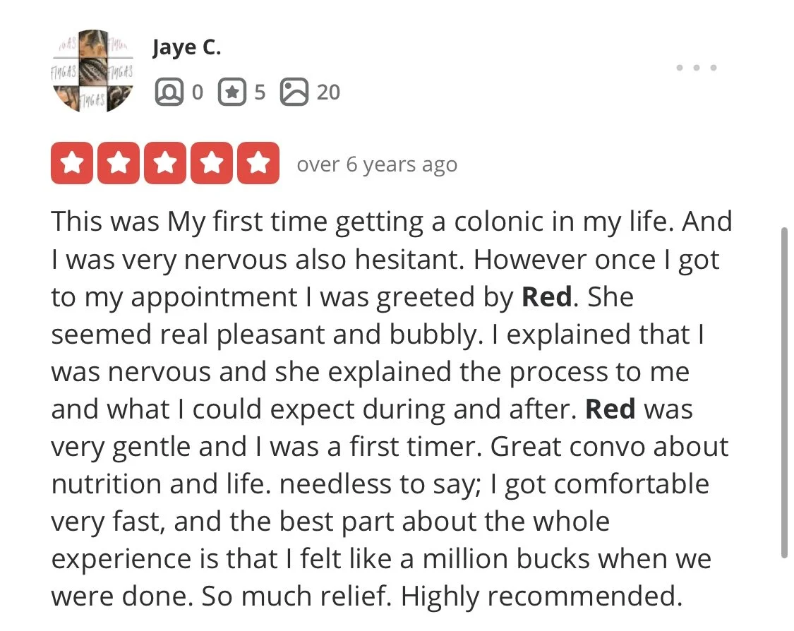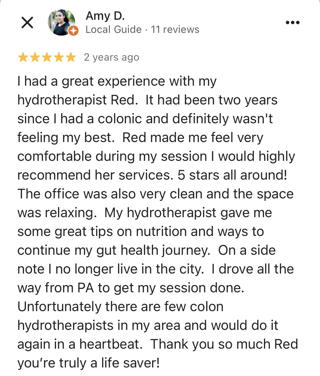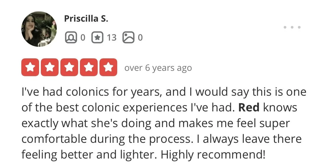 “...all of my experiences had been uncomfortable, clinical, awkward, and even ineffective much of time—until i met Red. i always leave a session with her feeling light and energetic, and i find that colonics are a crucial part of my overall wellness routine—both physical and mental.”